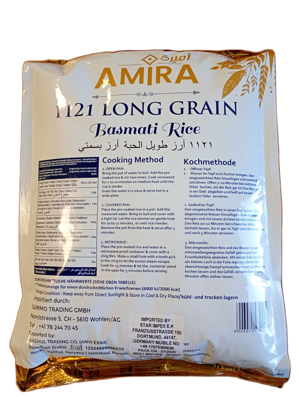Amira Long Grain Basmati Rice is naturally low in fat, gluten-free, and a source of essential nutrients. Its strong, firm texture and superb elongation properties make it perfectly suited for a wide variety of cuisines, including rich, traditional Indian dishes like Biryani and Pilafs, or simply as a side to curries and gravies.